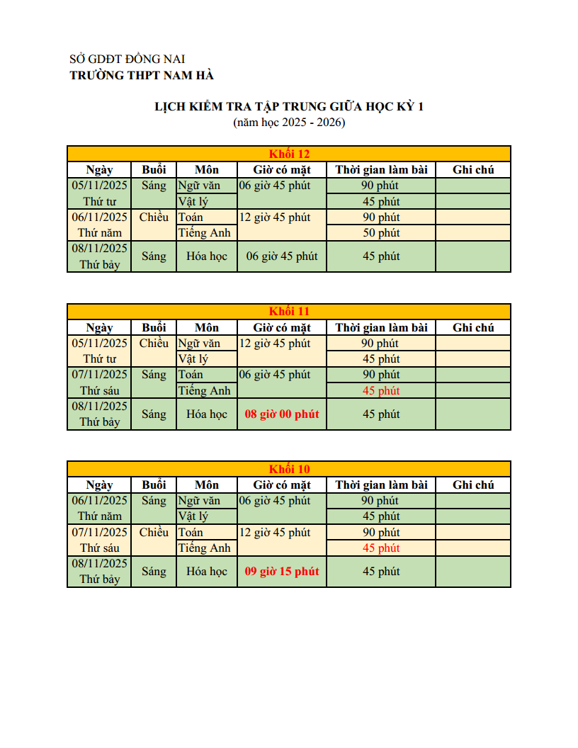 Lịch kiểm tra giữa kỳ 1 (2025-2026) các môn kiểm tra tập trung