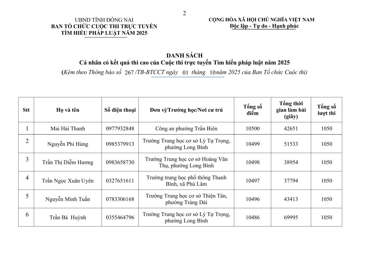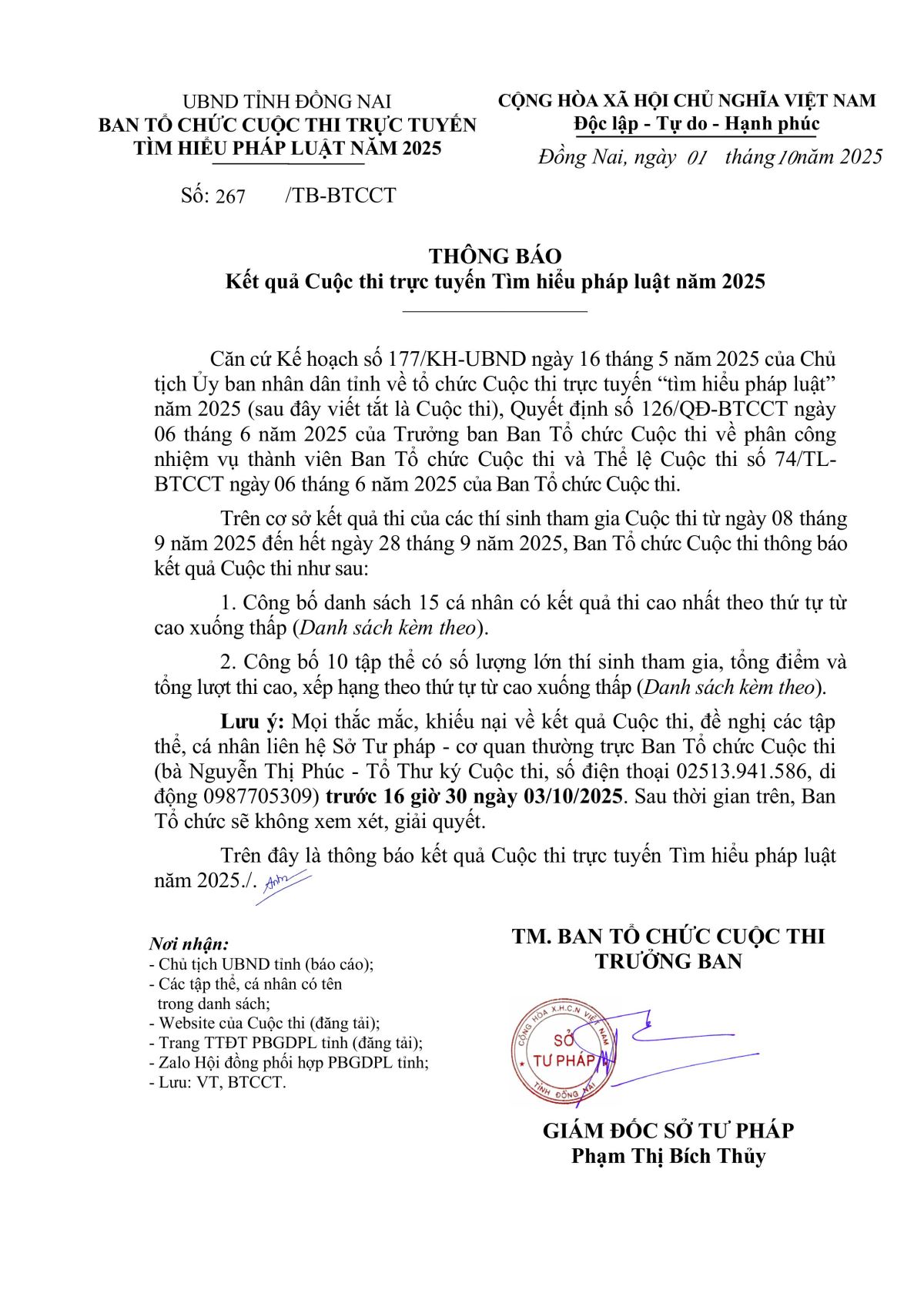 Chủ tịch UBND tỉnh ban hành Kế hoạch số 177/KH-UBND ngày 16 tháng 5 năm 2025 của Chủ tịch Ủy ban nhân dân tỉnh về tổ chức Cuộc thi trực tuyến “tìm hiểu pháp luật” năm 2025 với nội dung thi xoay quanh các quy định pháp luật về các lĩnh vực: trật tự, an toàn giao thông; phòng, chống mua bán người; Phòng cháy, chữa cháy và cứu nạn, cứu hộ; bảo hiểm xã hội; an ninh mạng. Cuộc thi dành cho đối tượng là Công dân Việt Nam từ đủ 15 tuổi trở lên đang sinh sống, học tập và làm việc trên địa bàn tỉnh Đồng Nai.